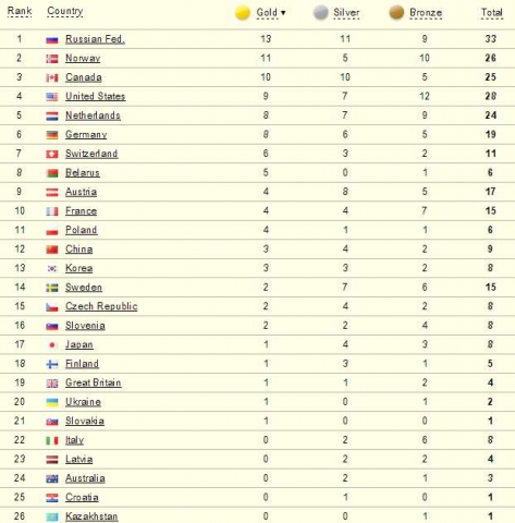 Երկրորդ տեղը գրավեցին նորվեգացիները, ովքեր ունեն 11 ոսկե, 5 արծաթե և 10 բրոնզե մեդալ: Լավագույն եռյակը եզրափակեցին 10 ոսկե, 10 արծաթե և 5 բրոնզե մեդալ նվաճած կանադացիները, իսկ ամերիկացիները հայտնվեցին չորրորդ տեղում՝ 9 ոսկե, 7 արծաթե և 12 բրոնզե մեդալ: Սոիչում մեդալի արժանացան 26 երկրներ: