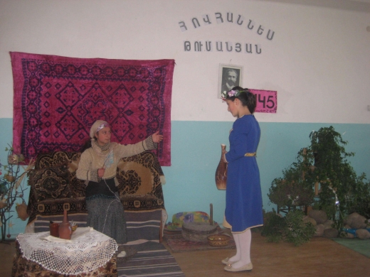 Դահլիճը լցված էր թումանյանական շնչով: Մի կողմում Լոռվա չքնաղ բնությունն էր, Թումանյանի աշխարհը՝ իր բարձր սարերով, սառնորակ աղբյուրներով, հազարագույն ու հազարաբույր ծաղիկներով, մյուս կողմում Թումանյանի տոհմածառն էր, ծնողների ու տասը զավակների նկարները: Դահլիճի մի անկյունը կահավորված է գրողի ապրած ժամանակաշրջանը ներկայացնող իրերով՝ հին հայկական կարպետներ, կուժ ու կուլա, ճրագակալ, երկանք, ձեռագործ ժանյակներ: