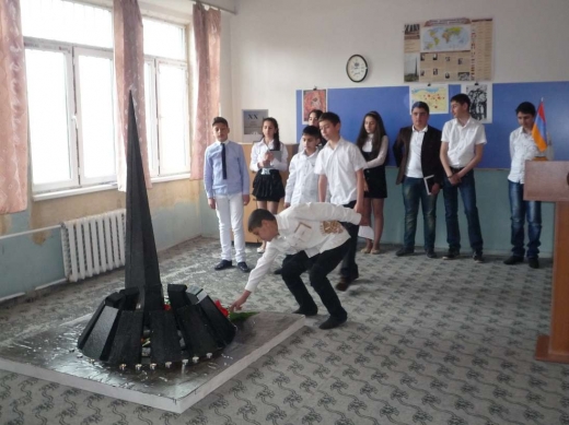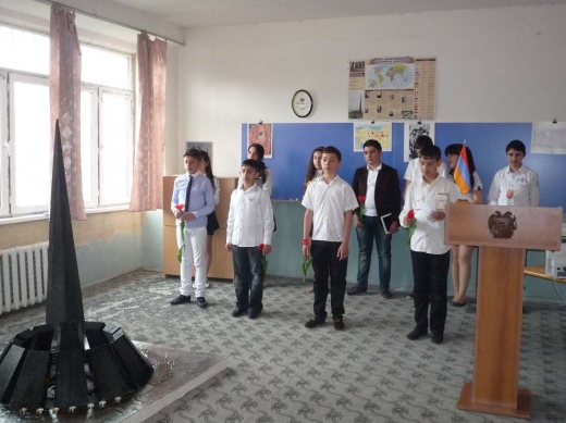 Շառլ Ազնավուրի ‹‹Ավե, Մարիա›› երգի հնչյունների ներքո աշակերտները ծաղիկներ դրեցին  Ծիծեռնակաբերդի հուշահամալիրի՝ գեղագիտական առարկաների մեթոդմիավորման նախագահ Լ. Մաթևոսյանի ջանքերով պատրաստած մանրակերտին, այնուհետև հատվածներ արտասանեցին Պ. Սևակի ‹‹Անլռելի զանգակատուն›› պոեմից: Հնչեց Կոմիտասի ‹‹Կռունկը››: Կոմիտասյան երգերը թափանցեցին ներկաների ներաշխարհը, քանզի այն կարող է վերակենդանացնել մարդկային հոգին, հարություն տալ ազգային ինքնությանը, էությանը: