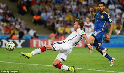 0:0, և խաղը տեղափոխվեց լրացուցիչ ժամանակ: Այստեղ թիմերի խաղում նկատվում էր զգուշություն, բայց արգենտինացիներն ունեցան ևս մեկ 100 տոկոսանոց գոլային պահ: Այս անգամ մի քանի մետրից դարպասը չկարողացավ գրավել փոխարինման դուրս եկած Ռոդրիգո Պալասիոն, ինչից հետո գործեց ֆուտբոլի չգրված օրենքը: Փոխարինման դուրս եկած Մարիո Գյոտցեն 113-րդ րոպեին բացեց հաշիվը՝ խփելով գերմանացիների հաղթական գոլը: Վերջնամասն անցավ լարված պայքարում, սակայն դարպասի նոր գրավումներ չարձանագրվեցին:
