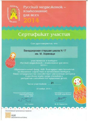 Վանաձորի Հովհ. Թումանյանի անվան 3-րդ դպրոցում կայացավ «Ռուսական մեդվեժոնոկ» և «Մեղու» 2014 մրթցույթների հավաստագրերի հանձնում: