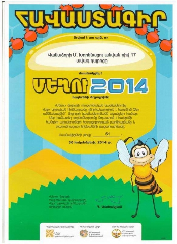 Վանաձորի Մովսես Խորենացու անվան թիվ 17 ավագ դպրոցի սաներ Մարետա Պապանյանը (7-րդ դասարան) և Սուրեն Պառավյանը (9-րդ դասարան) պարգևատրվեցին խրախուսական  հավաստագրերով և  հուշանվերներով: