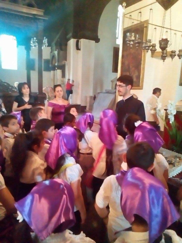 Աշակերտներին բաց խորանի մոտ դիմավորեց Բարեշնորհ Դավիթ Սրկ. Հովհաննիսյանը: Աշակերտներին ուղեկցեց Մայր Տաճար, մանրամասնորեն տեղեկություններ հաղորդեց Տաճարի կառուցման մասին: