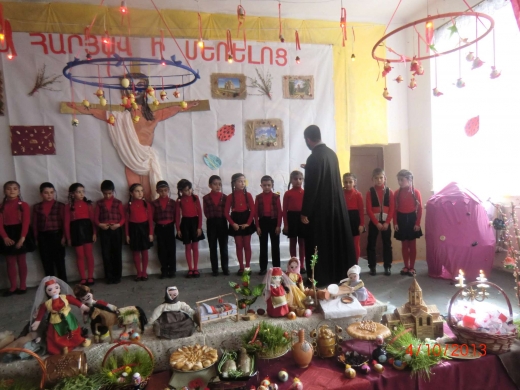 Դեռ դպրոցի բակից տիրում էր զատկական տրամադրությունը: Դահլիճն ամբողջովին զարդարված էր Զատկի խորհրդանիշներով: Կենաց ծառը զարդարված էր երեխաների ձեռքերով պատրաստված խաղալիքներով: