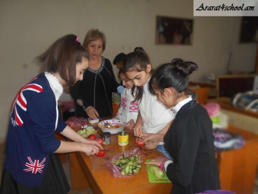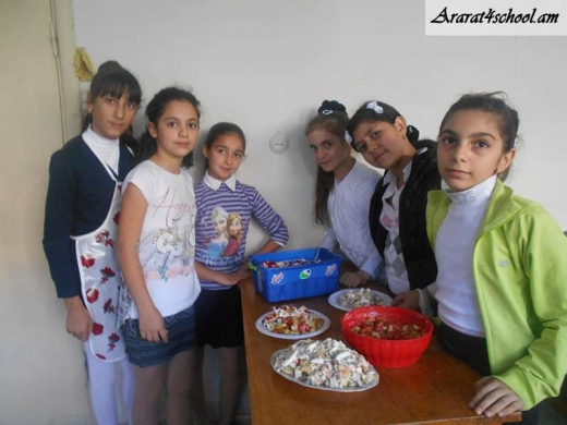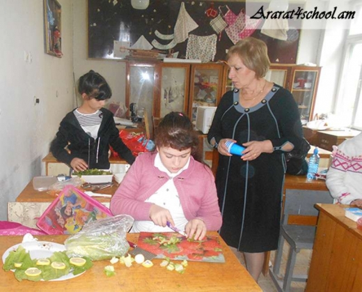 VI դասարանի աշակերտները աղցան պատրաստելիս գործնական աշխատանքի դասին :