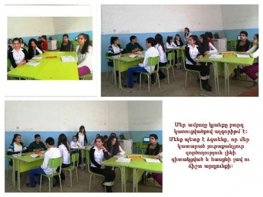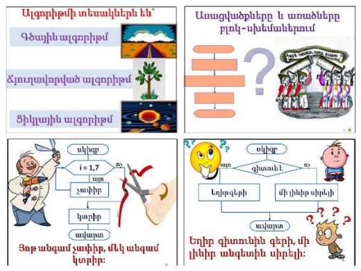 Արարատի մարզի Վերին Արտաշատի միջնակարգ դպրոցի 9-րդ դասարանում ուսուցչուհի Ս. Թամազյանն անցկացրեց բաց դաս ինֆորմատիկա առարկայից: Դասի թեման ալգորիթմն էր: Դասարանը բաժանված էր խմբերի՝ ալգորիթմի տեսակների անվանումներով՝ գծային, ճյուղավորված և ցիկլային: Ողջ դասն ուղեկցվում էր համակարգչային ցուցադրմամբ: Դասի թեման տրվեց նկար-հանելուկի/ռեբուսի/ օգնությամբ: Աշակերտները պատմեցին ալգորիթմ բառի ծագման մասին: Այնուհետև տրվեցին ալգորիթմի սահմանման տարբեր ձևակերպումներ, աշակերտները բերեցին ալգորիթմների օրինակներ առօրյա կյանքից, թվարկեցին ալգորիթմի հատկությունները, ներկայացման ձևերը, տեսակները, ցույց տվեցին ալգորիթմի գրաֆիկական ներկայացման ժամանակ օգտագործվող բլոկներն՝ իրենց անվանումներով և նշանակությամբ: Շատ հետաքրքիր էր հետևյալ առաջադրանքը. տրված էին առակներ, ասացվածքներ բլոկ-սխեմաներով: Աշակերտները ըստ այդ սխեմաների ասում էին առածը կամ ասացվածքը: Ալգորիթմով էր ներկայացված նաև ֆիզկուլտ-դադարը: Աշակերտները լուծեցին թեմային համապատասխան էլեկտրոնային թեստեր, կատարեցին անհատական առաջադրանքներ, կազմեցին տրված կողմերով եռանկյան մակերեսը հաշվելու ալգորիթմը և բլոկ-սխեման: Վերջում թեմայի հիմնական հասկացությունների յուրացման նպատակով լուծեցին խաչբառ՝ համակարգչային ցուցադրմամբ: Ուսուցչուհին դասն ավարտեց հետևյալ խոսքերով. «Մեր ամբողջ կյանքը բարդ կառուցվածքով ալգորիթմ է: Մենք պետք է ձգտենք, որ մեր կատարած յուրաքանչյուր գործողություն լինի գիտակցված և հասցնի լավ ու ճիշտ արդյունքի»: