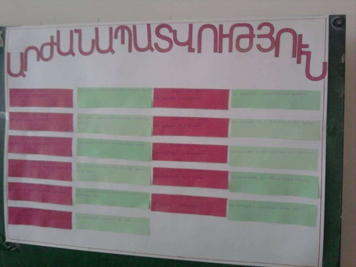 Մարտի 14-ին Արա Հարությունյանի անվան միջնակարգ դպրոցում դասղեկի բաց դաս էր՝ XI դասարանի դասղեկ` Արմինե Խրլակյանի նախաձեռնությամբ: Դասի թեման էր՝« Արժանապատվություն» 1.Դասի նպատակն էր՝ աշակերտներին օգնել գիտակցելու միջավայրի և շրջապատի վերաբերմունքը երեխայի ձևավորման գործում: 2.Խթանել անձի ինքնադաստիարակման և ինքնակատարելագործման ձգտումը: Դասը կազմակերպված էր համագործակցային եղանակով: Դասարանը բաժանված էր 2 խմբի: 1-ին խումբը ներկայացնում էր արժանապատվության ամենակարևոր դրսևորումներից մեկը՝ «Բարություն» անվամբ: 2-րդ խումբը ներկայացնում էր մարդու մյուս կարևոր արժանիքներից մեկը՝«Անկեղծությունը»: Դասի խթանման փուլում կատարվեց մտագրոհ, որի օգնությամբ ի հայտ բերվեց արժանապատվության դրսևորումները՝ բարի, անկեղծ, աշխատասեր, առաքինի, կամեցող, գթասիրտ, հայրենասեր: Մտագրոհ վարժությունը կատարելուց հետո աշակերտներին բաժանվեցին թերթիկներ, որի մեջ գրված էին անավարտ նախադասություններ: Պահանջն այն էր, որ աշակերտները պետք է լրացնեին անավարտ նախադասությունները՝ ընդգծելով արժանապատվության դրական ազդեցությունըերեխայի կյանքում: «Բարություն խմբին առաջադրվեց» հորինել պատմություն, որտեղ ոտնահարված կլինի որևէ երեխայի արժանապատվությունը: Մինչ «Բարություն» խումբը պատրաստ կլիներ, «Անկեղծություն» խմբին հանձնարարվեց լրացնել T–աձև աղյուսակը: Պահանջված էր՝ լրացնել «Պետք է» աղյուսակը: Նպատակն էր՝ գրել այն բոլոր մարդկային արժանիքները, որը մարդուն Մարդ կդարձնի: Աշակերտները լրացրեցին աղյուսակը, կարևորելով մարդկային արժանիքների մեջ հավատարմությունը, պատասխանատվությունը, վստահությունը, ծնողասիրությունը, ներողամտությունը: Մինչև աղյուսակի լրացները «Բարություն»խումբը հորինել էր մի հավանական պատմություն: Պատմությունը վերաբերում էր մի աղջիկ երեխայի, որը կորցրել էր իր ծնողներին ավտովթարի պատճառով և հայտնվել թոշակառու տատիկի խնամքին. - Ելնելով ծանր սոցիալական վիճակից Ինան երբեմն դպրոց էր գնում հին և անխնամ հագուստով, որն էլ առիթ էր տալիս համադասարանցիներին ծաղրել, ծիծաղել, ստորացնել, նսեմացնել երեխայի արժանապատվությունը: Ինան հասկանում էր, որ այլևս չի կարող այդպես շարունակվել և խնդրում է տատիկին, իրեն տեղափոխել ուրիշ դպրոց: Անկեղծություն խումբը լսելով հավանական պատմությունը պետք է փորձեր վերականգնել Ինայի կորցրած արժանապատվությունը և հնարեր պատմության շարունակությունը: Մինչև «Անկեղծություն» խումբը զբաղված էր պատմության շարունակությամբ, «Բարություն» խումբը պետք է լրացներ«Չի կարելի» աղյուսակը, որի նպատակն էր՝ չանել այնպիսի բաներ, որը կխեղաթյուրեր մարդ -անհատի Աստվածային կերպարը: Աշակերտների ակտիվ մասնակցությամբ ամբողջացվեց ախյուսակի 2-րդ կողմը,որտեղ աշակերտները պարսավեցին սուտը, բամբասանքը, նախանձը, դավաճանությունը, ստորությունը, ատելությունը, վրեժխնդրությունը, ծուլությունը և այլն: Աշխատանքն ավարտելուց հետո լսեցինք «Անկեղծություն» խմբին, որն արդեն պատմվածքի շարունակությամբ վերականգնել էր Ինայի կորցրած արժանապատվությունը` մեկ այլ դպրոց տեղափոխվելով, և դասղեկի հոգատարության ներքո գտնվելով: Դասղեկի բաց դասն ուներ ուսուցողական և դաստիարակչական նշանակություն և դասը ծառայեց իր նպատակին: Դասղեկ` Արմինե Խրլակյան