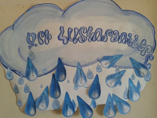 Ամփոփելով աշակերտների ունեցած գիտելիքները ջրի մասին՝ նրանք պատրաստեցին պաստառ «Ջրի հատկությունները» խորագրով: Ներկայացրին լրացուցիչ տեղեկություններ օվկիանոսների մասին, ջրի կարևոր դերի մասին հայտնեցին իրենց կարծիքները: Նոր նյութի մատուցումը կատարվեց հարուստ դիդակտիկ նյութերի համադրությամբ (էլեկտրոնային ցուցադրություն):
