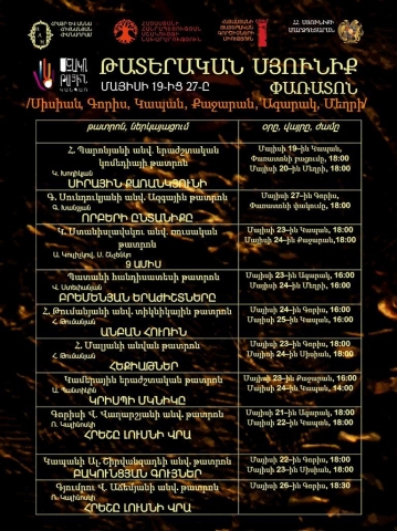 Մայիսի 19-27-ը առաջին անգամ կանցկացվի «Թատերական Սյունիք» փառատոնը: Փառատոնի գլխավոր նպատակն է Հանրապետության լավագույն թատրոնների ներկայացումների կազմակերպումը Սիսիան, Գորիս, Կապան, Քաջարան, Ագարակ և Մեղրի քաղաքներում: