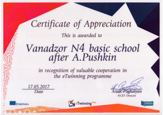 2017 թ. մայիսի 16-ից 17-ը «Էլիտ Պլազա» բիզնես կենտրոնում անցկացվեց երկօրյա համաժողով` նվիրված Հայաստանում Եվրոպական դպրոցների Իթվինինգ ծրագրի գործունեության 5-ամյակին։ Համաժողովին մասնակցեցին ՀՀ կրթության և գիտության նախարար Լևոն Մկրտչյանը, ծրագրին մասնակից ՀՀ ուսհաստատությունների, Լեհաստանի Էրազմուսպլյուսի և Իթվինինգի ազգային գրասենյակների և Իթվինինգի Կենտրոնական աջակցման ծառայության ներկայացուցիչներ: Համաժողովին մասնակցեց նաև ՀՀ Լոռու մարզի Վանաձորի Ա. Պուշկինի անվան № 4 հիմնական դպրոցի Իթվինինգի թիմը՝ տնօրեն Հ. Խումարյանը, մաթեմատիկայի ուսուցչուհի Լ. Քառյանը և ԷՀՄ օպերատոր Լ. Կարապետյանը: Համաժողովի ընթացքում ներկայացվեց 2013-2017թթ. ծրագրի ընթացքը, «Դպրոցների համագործակցության վիրտուալ համայնքի ձևավորման» ազգային ծրագիրը, ինչպես նաև նախանշվեց հետագա զարգացման հիմնական ուղղությունները։ Համաժողովի ընթացքում Հ. Խումարյանը հանդես եկավ «Իթվինինգը մեր դպրոցում» թեմայի շուրջ ելույթով՝ կիսվելով իր փորձով, խոսելով ծրագրի ընձեռած հնարավորությունների և ծրագրի շրջանակներում դպրոցի հետագա պլանների մասին: Իսկ Լ. Կարապետյանը ներկայացրեց 2016 թ. Ազգային մրցանակաբաշխության ժամանակ 2-րդ մրցանակի արժանացած «Իմ ոտնահետքը կարևոր է» նախագիծը: Նախարարը շնորհակալագրեր հանձնեց մի շարք դպրոցների, այդ թվում՝ Վանաձորի Ա. Պուշկինի անվան № 4 հիմնական դպրոցին՝ Իթվինինգ ծրագրում հաջող և արժեքավոր համագործակցության համար: Սիրով շնորհավորում ենք մեր դպրոցի թիմին և մաղթում նորանոր հաջողություններ: