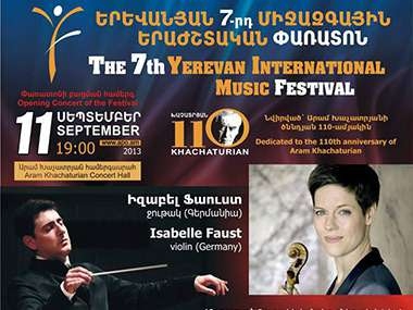 Հիշեցնենք, որ Երևանյան 7-րդ միջազգային երաժշտական փառատոնը մեկնարկելու է սեպտեմբերի 11-ին: Փառատոնի հանդիսավոր բացմանը  ելույթ է ունենալու գերմանացի ջութակահար Իզաբել Ֆաուստը: Փառատոնը նվիրվում է Արամ Խաչատրյանի 110-ամյակին: Փառատոնի գեղարվեստական ղեկավարներն են Ալեքսանդր Չաուշյանը և Էդուարդ Թոփչյանը: Փառատոնն իրականացվում է ՀՀ Առաջին Տիկին Ռիտա Սարգսյանի բարձր հովանու ներքո և մշակույթի նախարարության աջակցությամբ: