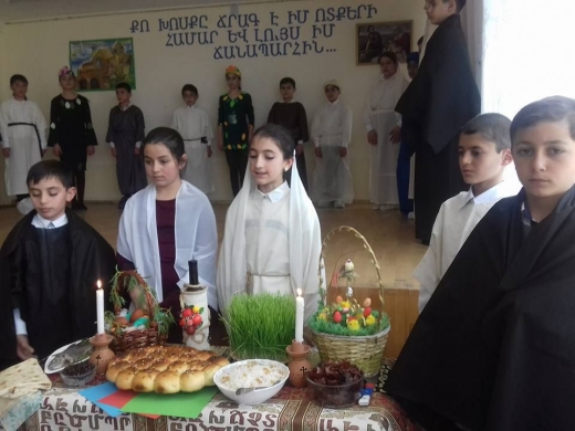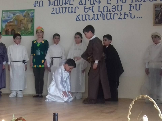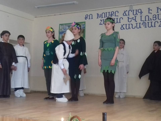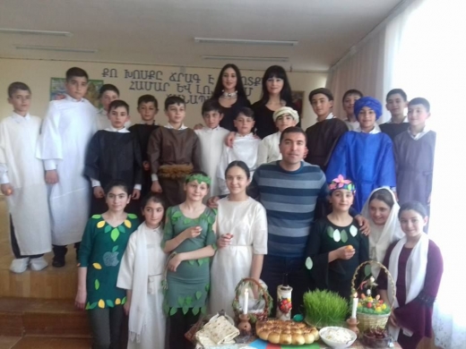 Սուրբ Զատիկ. Մեր Տիրոջ՝ Հիսուս Քրիստոսի Հրաշափառ Հարության տոն: VI << Ա >> դասարանի դասղեկ Մ. Նիկողոսյանը և պատմության ուսուցչուհի Ա.Հարությունյանը կազմակերպել էին հրաշալի միջոցառում նվիրված Սուրբ Զատկի տոնին։Բեմականացման,երգ ու պարի միջոցով աշակերտները ներկայացրեցին տոնի խորհուրդն ու նշանակությունը։ Հիսուս Քրիստոսի հրաշափառ Հարության տոնը կոչվում է նաև Զատիկ, որը նշանակում է զատում, բաժանում, հեռացում մեղքերից և վերադարձ դեպի Աստված: Զատիկը Հայ Առաքելական Սուրբ Եկեղեցու 5 տաղավար տոներից մեկն է: Հիսուս Քրիստոսի խաչելությունից և մահից հետո` երեկոյան, բարեպաշտ մարդիկ Նրա մարմինը իջեցրեցին խաչից և դրեցին վիմափոր գերեզմանի մեջ՝ փակելով մեծ քարով: Երեք օր հետո` կիրակի առավոտյան, յուղաբեր կանայք` Մարիամ Մագդաղենացին, Հակոբի մայր Մարիամը և Սաղոմեն, գնացին գերեզման՝ անուշաբույր յուղերով օծելու Քրիստոսի մարմինը, սակայն զարմանքով տեսան, որ քարայրի մուտքի քարը հեռացված է, իսկ գերեզմանը` թափուր: Մինչ նրանք տարակուսում էին, երևացին երկու հրեշտակ և ասացին. «Ինչո՞ւ ողջին մեռելների մեջ եք փնտրում: Այստեղ չէ, այլ՝ հարյավ։ Հարության լուրը կանայք ավետեցին առաքյալներին, որից հետո Հիսուս երևաց նրանց: Քրիստոսի Հարությունը դարձավ քրիստոնեական վարդապետության և հավատի հիմքը։ Աշակերտները ներկայացրեցին տոնին պատրասվելու և դիմավորելու կարգը։ Զատկի տոնին հավատացյալները ձու են ներկում: Ներկված ձուն համարվում է Հարության և նոր կյանքի խորհրդանիշ: Կարմիր գույնը խորհրդանշում է խաչյալ Հիսուսի կենդանարար արյունը, որ թափվեց մարդկության փրկության համար։ «Միայն Զատկին ենք ձու ներկում, որովհետև ձուն օրինակ է աշխարհի», և ինչպես իմաստուններն են ասում. «Դրսի կեղևը նման է երկնքին, թաղանթը՝ օդին, սպիտակուցը՝ ջրին, դեղնուցն էլ երկիրն է: Իսկ կարմիր գույնը խորհրդանշում է Քրիստոսի արյունը: Եվ մենք կարմիր ձուն մեր ձեռքերի մեջ առնելով` հռչակում ենք մեր փրկությունը»: Հիսուս Քրիստոսի հրաշափառ Հարության տոնը Հայ Եկեղեցին նշում է հիսուն օր շարունակ՝ մինչև Հոգեգալստյան (Պենտեկոստե) տոն: Վերջին տասն օրերը նվիրված են Քրիստոսի Համբարձմանը: Հինանց շրջանը ավարտվում է Հոգեգալստյան տոնով: Համբարձումից տասն օր հետո, ըստ Քրիստոսի խոստման, առաքյալների վրա իջավ Աստծո Սուրբ Հոգին, և զորացած առաքյալները վկայեցին Քրիստոսին ամբողջ աշխարհով: ՔՐԻՍՏՈՍ ՅԱՐԵԱՒ Ի ՄԵՌԵԼՈՑ: ՕՐՀՆԵԱԼ Է ՅԱՐՈՒԹԻՒՆՆ ՔՐԻՍՏՈՍԻ: