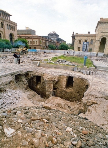 Հանրապետության հրապարակի վերանորոգման ժամանակ պարզվել է, որ հրապարակի ողջ տարածքում 17-րդ դարի շինություններ են: Կառույցներն ուսումնասիրել են ՀՀ ԳԱԱ Հնագիտության և ազգագրության ինստիտուտի միջին դարերի հնագիտության բաժնի ղեկավար Գրիգոր Կարախանյանը, հնագետներ Ֆրինա Բաբայանն և Աղավնի Ժամկոչյանը: Պեղումների արդյունքում հայտնաբերվել են հրապարակի և հարակից փողոցների ասֆալտի տակ պահպանված 17-րդ դարին պատկանող և անցյալ դարասկզբին քանդված շենքերի նկուղային հարկաբաժիններ: Քառակուսի հատակագծով սրահի տարբեր բաժանմունքները ստեղծվել են խաչվող թաղերով ավարտվող միջնապատերի շնորհիվ: Ըստ հնագետների՝ հրապարակում բացահայտված կառույցները 17-րդ դարի այն շենքերի նկուղներն են, որոնք պատկերվել են ֆրանսիացի ճանապարհորդներ Ժան Բատիստ Տավերնիեի և Ժան Շարդենի երևանյան համայնապատկերներում: Ֆրանսիացի ճանապարհորդ Ժան Բատիստ Տավերնիեն 1655 թ․-ին այցելել է Երևան, գծագրել այն: Նկարում մանրամասնորեն պատկերված է «Քրիստոնեական թաղամասը»՝ երկհարկ և եռահարկ քարի շենքերով: 1679 թ․-ին Երևանում տեղի է ունեցել ավերիչ երկրաշարժ, որը, ըստ Զաքարիա Սարկավագի թողած հիշատակությունների, ոչինչ «քարը քարի վրա չի թողել»: Շինություններն ավերվել են, սակայն մնացել են դրանց նկուղային հարկերը: Բացված նկուղներն ընդգրկում են հրապարակի ողջ տարածքը: Պատերի բարձրությունը 4.50 մետր է, սվաղը՝ 7 սմ: Կառույցները պահպանվել են ամբողջությամբ, մուտքերով: Հայտնաբերվել է գունազարդ խեցեղեն, աշխատանքային գործիքներ: Հայտնաբերվել են նաև Ապիրատ իշխանի կողմից 11 դարում կառուցված ջրատար խողովակներ, որոնք ծառայել են մինչև 19 դարը: Գիտնականներն, ուսումնասիրելով շինության պատերը, կարծել են, որ դրանք, աղյուսից են, սակայն հետո պարզվել է, որ պատերը կառուցված են հավասարաչափ կտրտված տուֆի սալիկներից: Գտածոները նաև խոսում են այն մասին, որ 17-18-րդ դարի Երևանը պատահական քաղաք չէր, այլ առևտրատնտեսական կենտրոն: Սակայն քաղաքի կենտրոնում պատահաբար բացված այս պատմական գանձարանը լիարժեք ուսումնասիրել չի հաջողվել. հապճեպ կատարված բարեկարգման աշխատանքների արդյունքում հրապարակի կենտրոնում կառուցվել է հայտնի խճանկարը, իսկ պեղված տարածքները ծածկվել են հողով ու ավազով։ 1837 թ․-ին Ցարական ժամանակաշրջանում սկսվել է Էրիվանի նոր նախագծի գծագրումը, որը հաստատվել է 1862 թ․-ին: Հենց այդ ժամանակ էլ կառուցվել է քաղաքի հրապարակը, որի տակ են անցել այս շինությունները: Այդ ժամանակ կառուցվել են նաև այսօրվա Արամի, Մաշտոց, Տերյան, Նալբանդյան և Հանրապետության փողոցները: Չի բացառվում, որ այդ փողոցներում էլ կարող է պատկերը նույնը լինել: Աղբյուրը՝ Operativ.am