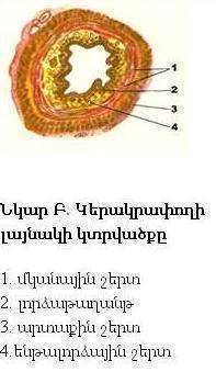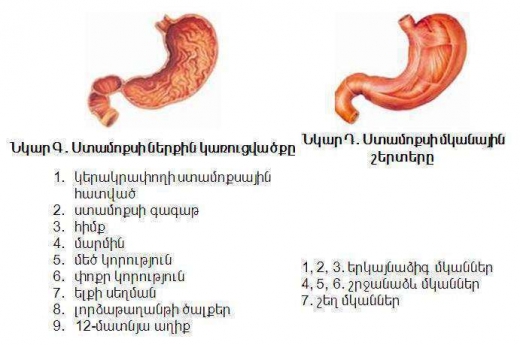 Ստամոքսի հարթ մկաններից կազմված մկանաշերտի թելերը տարբեր ուղղություններ ունեն (նկար Դ): Դրանք ապահովում են ստամոքսի տարատեսակ կծկումները: Օղակաձև մկանաթելերը, ստամոքսաելքում հաստանալով, կազմում են ելքի սեղմանը (սֆինկտեր), իսկ լորձաթաղանթն առաջացնում է շրջանաձև ծալք, որը ստամոքսի ելքի փականն է: Սրանք ստամոքսաելքի անցքը փակ են պահում այնքան ժամանակ, մինչև ստամոքսում ավարտվում է մարսողության պրոցեսը: