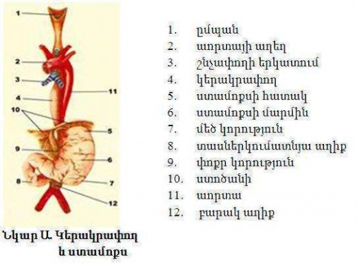 Բերանի խոռոչում սննդանյութը մեխանիկական և քիմիական որոշակի փոփոխությունների ենթարկվելուց հետո անցնում է ստամոքս, մնում 6-8 ժամ, ապա, աստիճանաբար, առանձին բաժիններով անցնում 12-մատնյա աղիք: